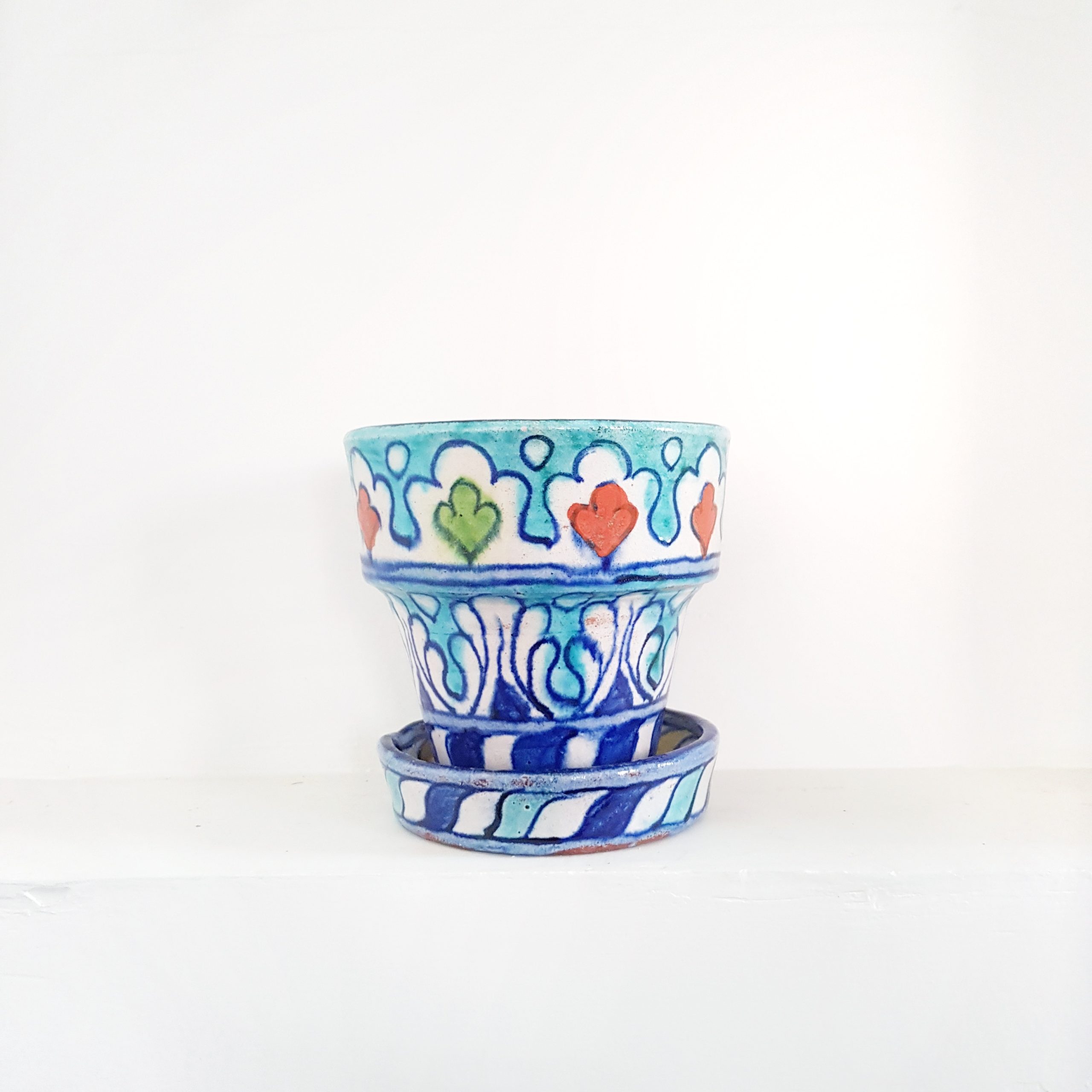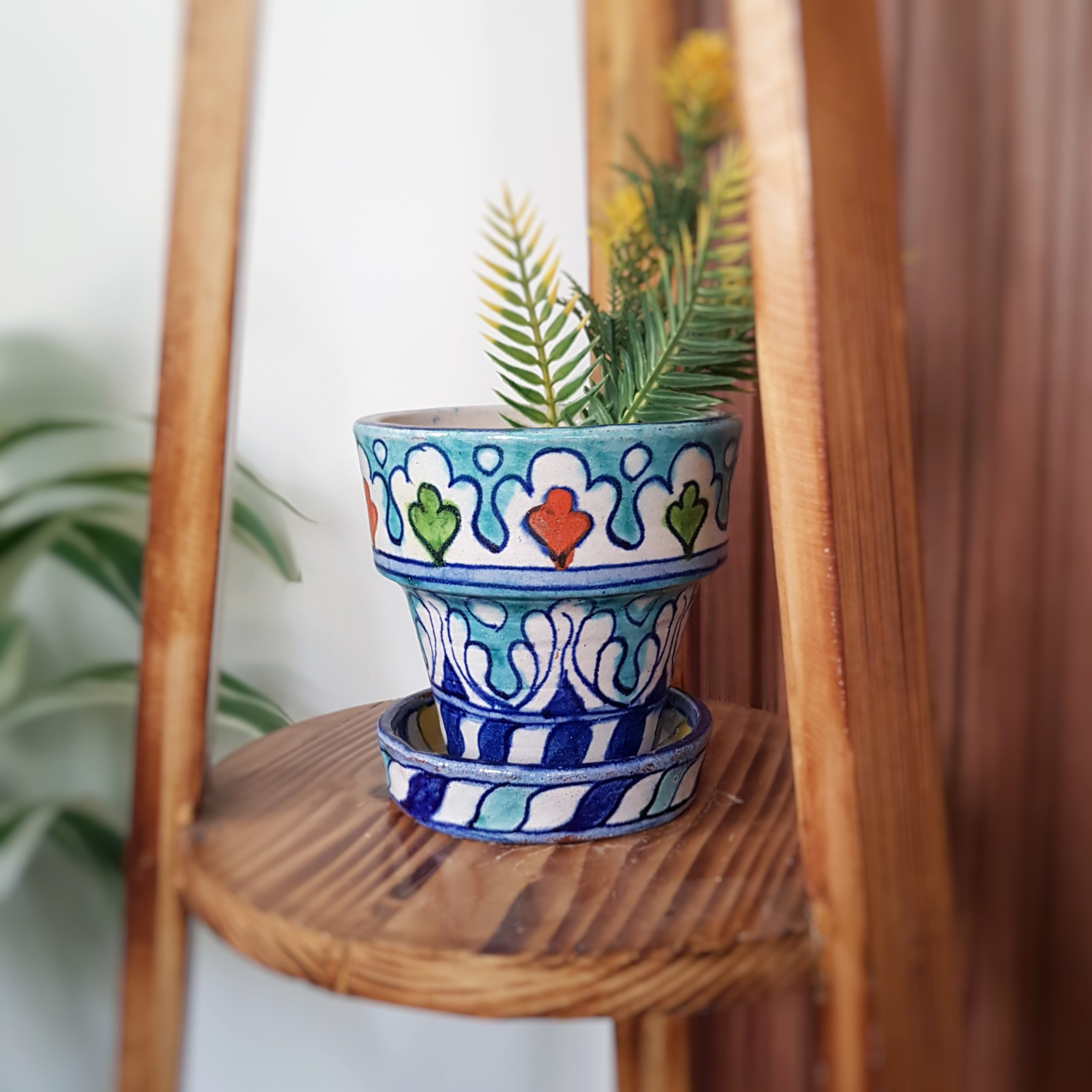 Perfect for small plants and succulents, this breathable terracotta pot supports healthy growth, while the matching plate neatly collects excess water, keeping your surfaces clean. Handpainted in vibrant hues, it’s a petite accent that adds freshness, warmth, and cultural character to any corner of your home.