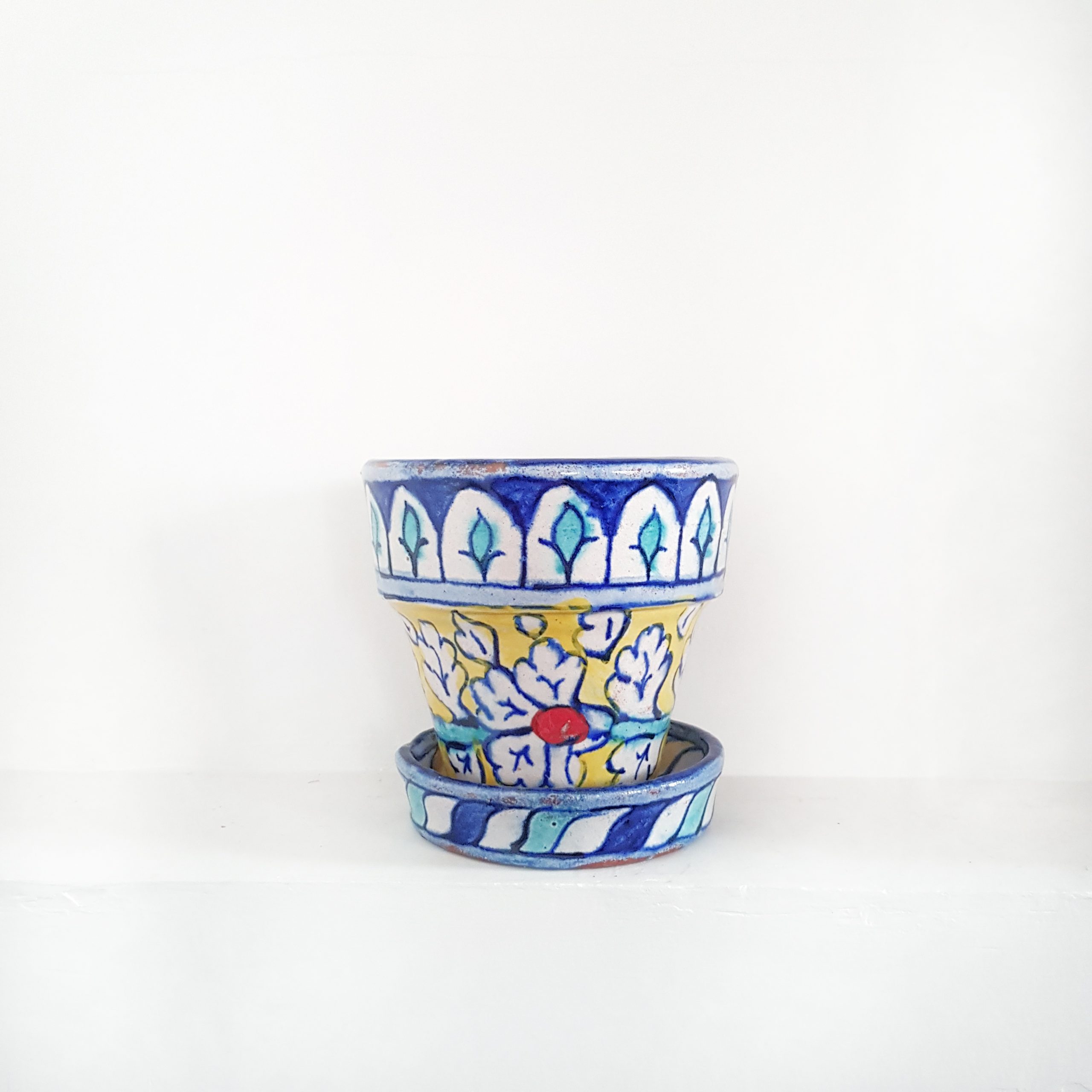 Perfect for small plants and succulents, this breathable terracotta pot supports healthy growth, while the matching plate neatly collects excess water, keeping your surfaces clean. Handpainted in vibrant hues, it’s a petite accent that adds freshness, warmth, and cultural character to any corner of your home.